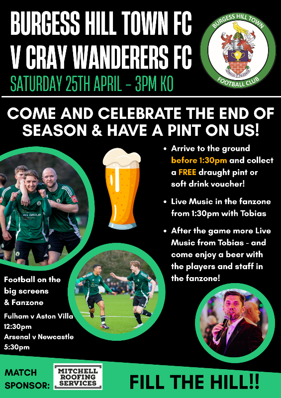 The curtain falls down on another season for Cray Wanderers as the Wands head to Burgess Hill Town for a meeting between 7th and 8th in the Isthmian Premier League table and two sides that can look back on a satisfactory season.  Kick off 3 pm.