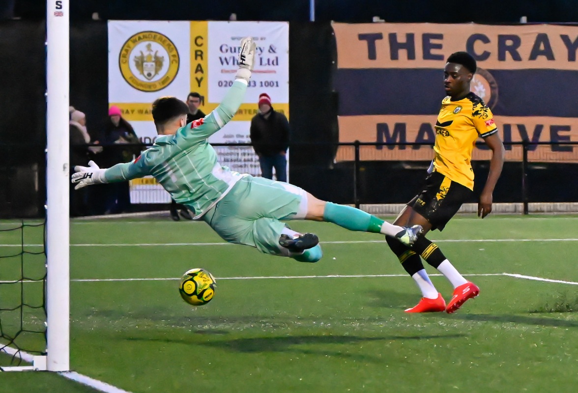 Carshalton threatened from another corner from which Read glanced a header wide while for Cray, Frankie Morgan played a great ball to Mongoy down the left who drove towards goal but fired into the side netting.