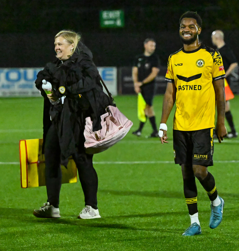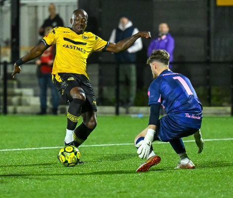 On a pretty still and fairly mild night the game began with both teams looking confident on the ball but Cray had the first half chance with a fine passing move with Adrian Owiredu Gyamera finding Ashley Nzala down the left and his pass found Kareem Isiaka whose shot was blocked. Unfortunately, Kareem had to go off in the 7th minute with an injury and was replaced by Chris Dickson.