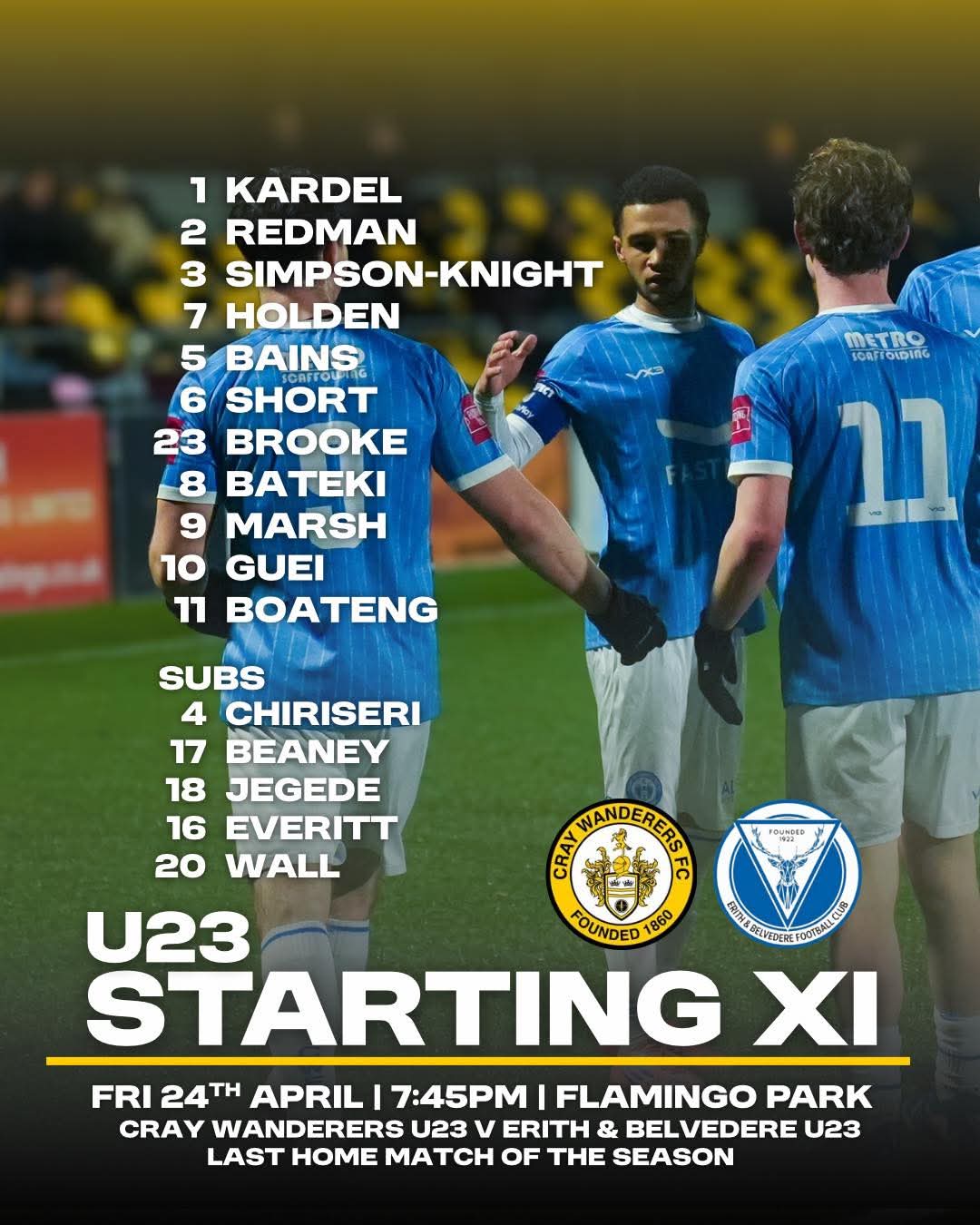 A look back to Friday night as the Cray Wanderers U23s remain on top of the SCEFL Development League West after a 6-1 win vs Erith & Belvedere U23s in the final home game of the season.