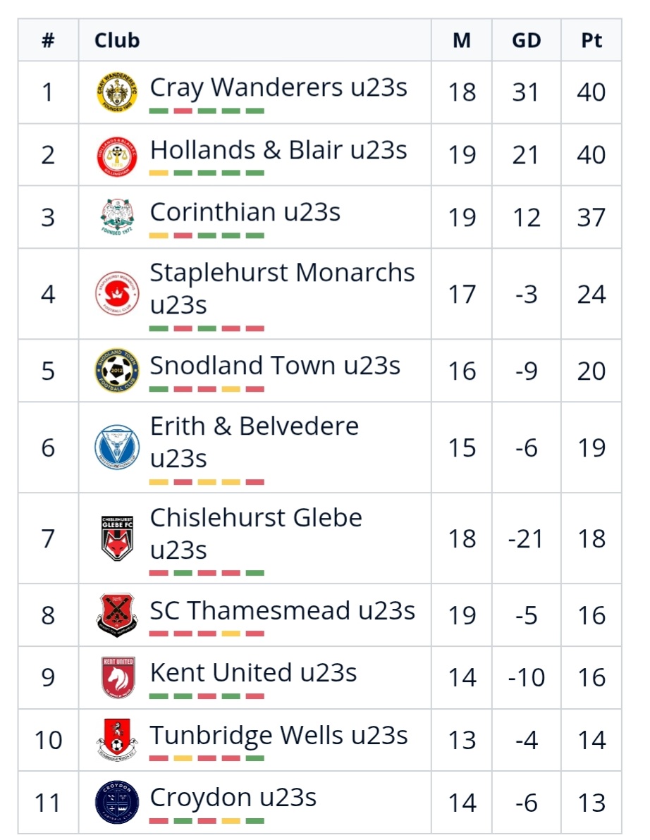 Cray have two games left to Hollands & Blair’s one.  The Wands travel to Snodland Town on Thursday 30th April and then are at Kent United on Tuesday 12th May. Hollands & Blair have the Kent Intermediate Cup Final vs Tonbridge Angels U18s on 6th May and the last league game at home to Croydon has yet to be announced.