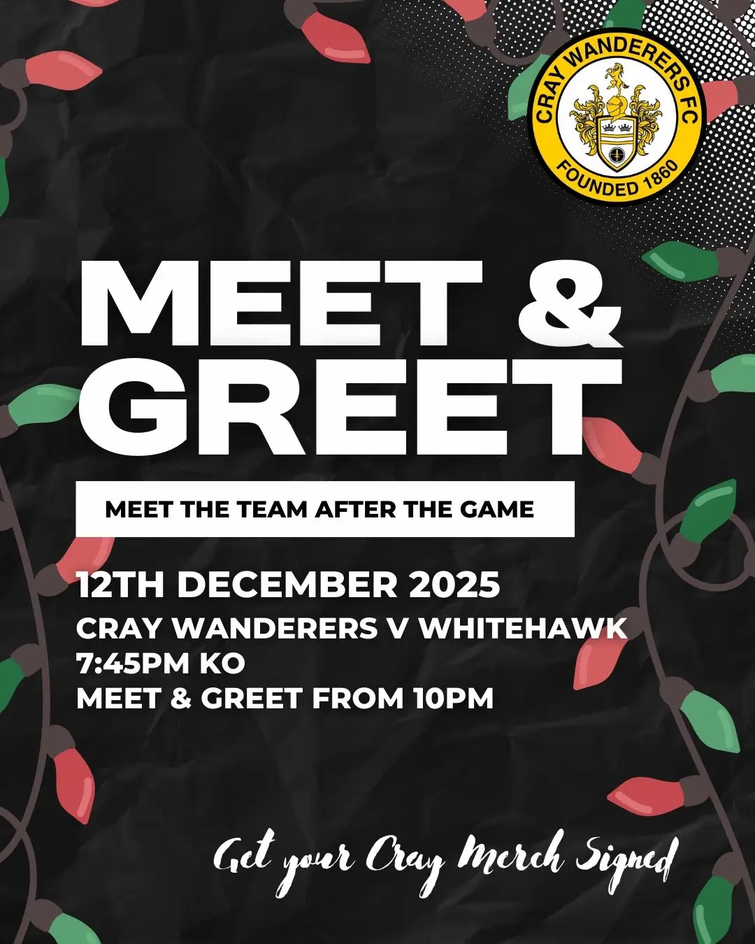 Admission £15 adults, £10 concessions, £5 U17-18’s, U16s free on the gate or online at www.cray-wanderers.com/tickets/ Printed match programme £3 on turnstile, merchandise including 2026 calendars for £10, Golden goal tickets, hot and cold food/drinks and bars to get into the Christmas mood.