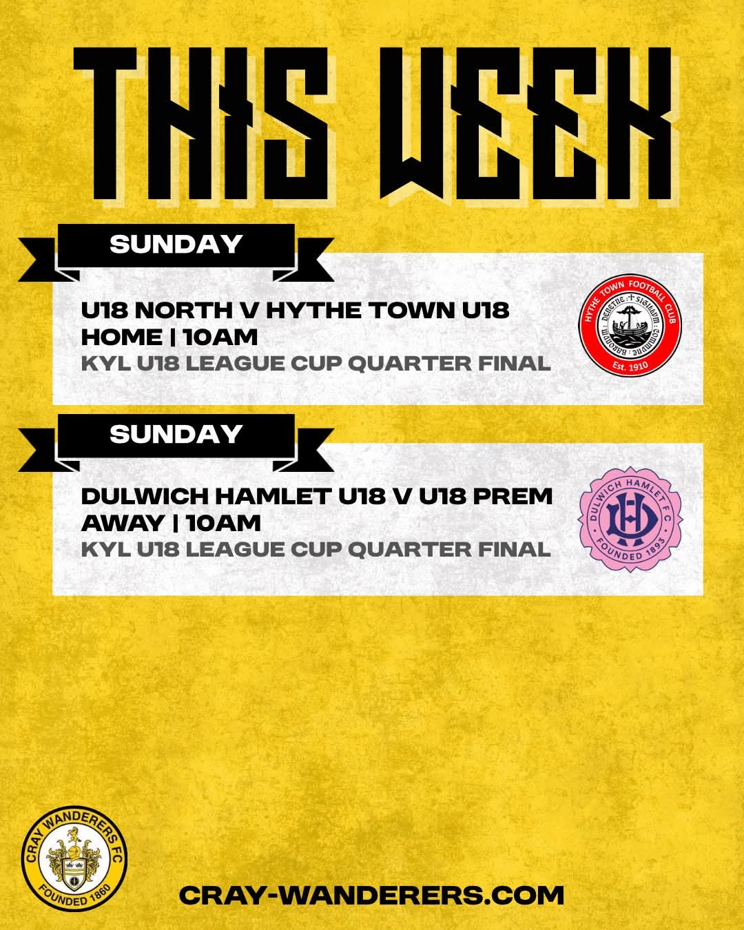 The two Cray Wanderers U18s sides have both reached the Kent Youth League Cup Quarter-Finals and both are in early morning action on Sunday.