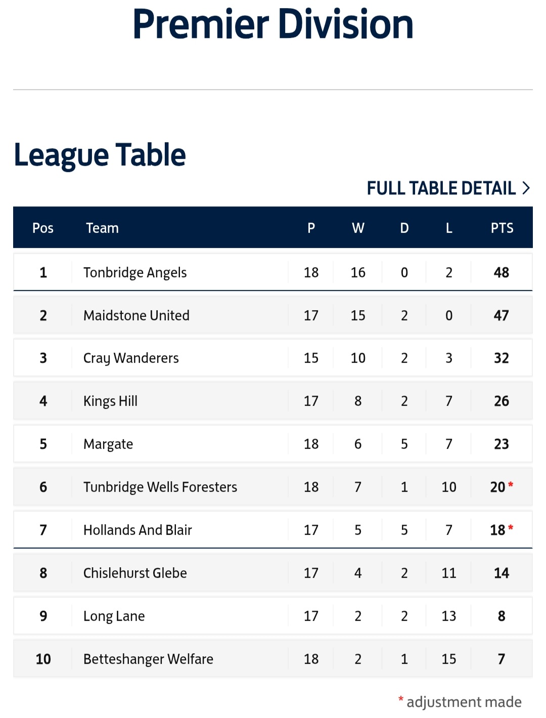 Tonbridge were awarded three points vs Long Lane yesterday to go top but Maidstone remain hot favourites to win the league undefeated with a match at Hollands & Blair on Sunday.