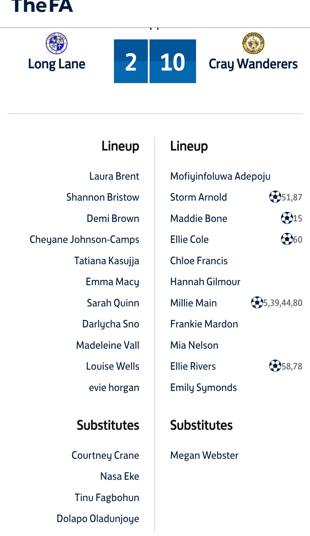 Long Lane Women 2 Cray Wanderers Women 10 (Main 5, 39, 44, 80, Bone 15, Arnold 51, 87, Rivers 58, 78, Cole 60) – SECWFL Premier – 19/4/26